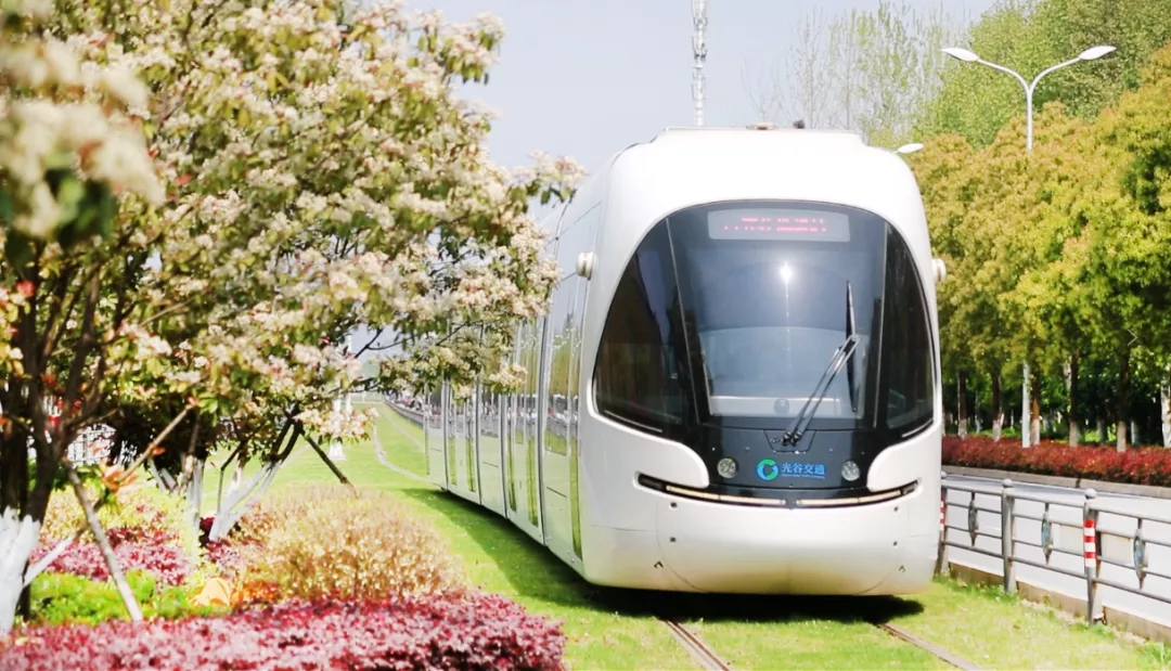 ▲恢復(fù)運營的有軌電車行駛駛?cè)胲囌?/p>