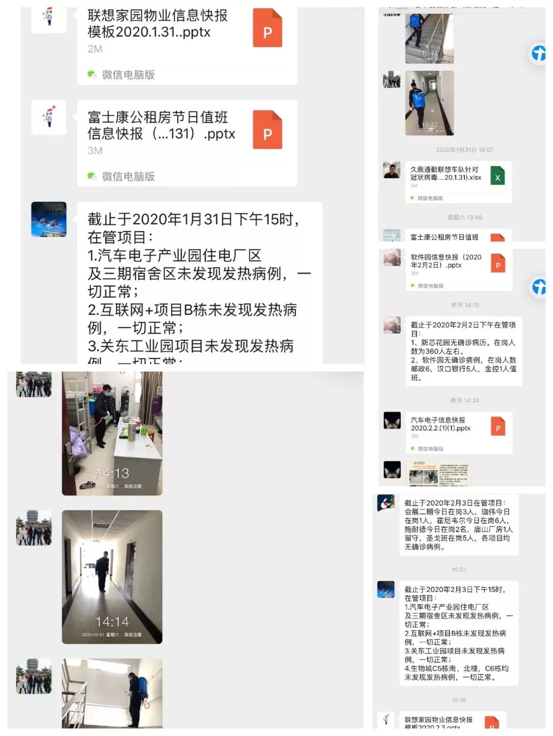 第二,保持信息暢通,做好緊急預(yù)案。各項(xiàng)目以信息快報(bào)方式報(bào)告疫情防治工作即一線工作人員身體狀況、公區(qū)消殺、出入人員體溫監(jiān)測登記、物資消耗等情況,對園區(qū)留守人員身體狀況進(jìn)行跟蹤監(jiān)測。