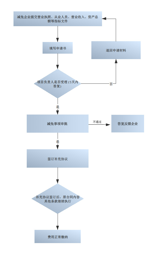 減免企業(yè)需提供營業(yè)執(zhí)照、從業(yè)人員、營業(yè)收入、資產(chǎn)總額等指標(biāo)文件,填寫《租金減免申請表》,按下述流程圖提交辦理。 企業(yè)將用印版掃描件壓縮打包,并以公司名稱命名,發(fā)送至11919179@qq.com。點(diǎn)擊左下角下載《租金減免申請表》等附件。(咨詢電話:027-87523399)